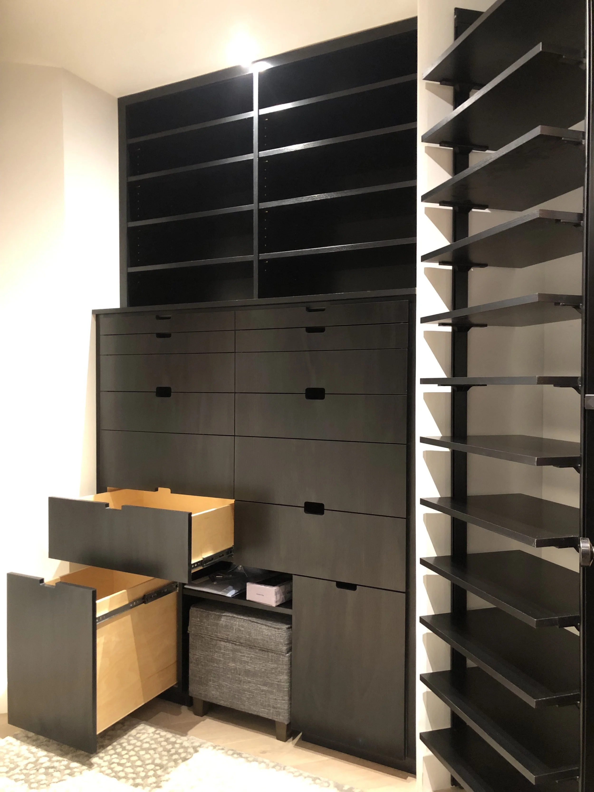 Adjustable shelves provide surfaces for more storage, while fixed, floating shelves typically display objects.